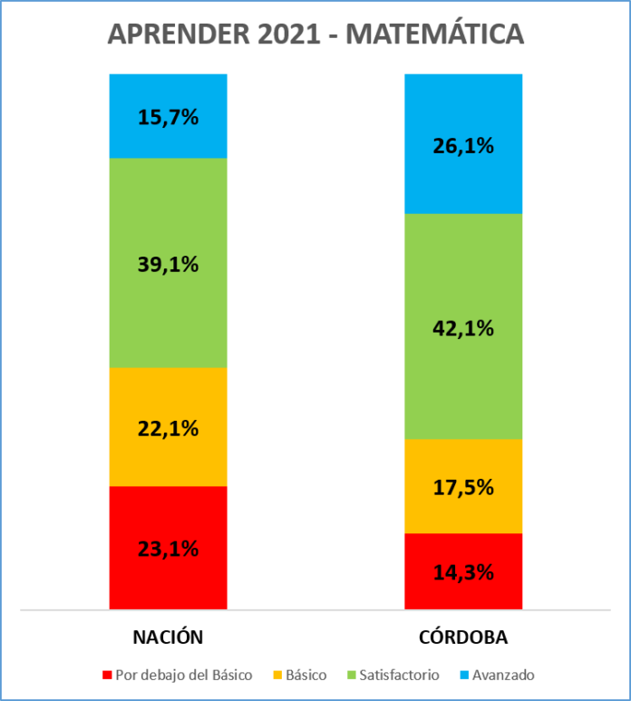 En cuanto a la primer asignatura, el promedio nacional de estudiantes con desempeños avanzados o satisfactorios ascendió a 54.8% (15.7 % con un nivel avanzado), lo que significa que Córdoba se encuentra 13.4 puntos por encima de la media del país.
